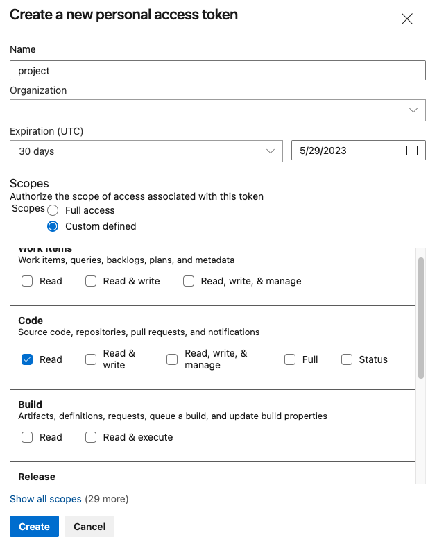 - Click Create. Note: For more information on creating access tokens, see the documentation for Azure DevOps (link).
