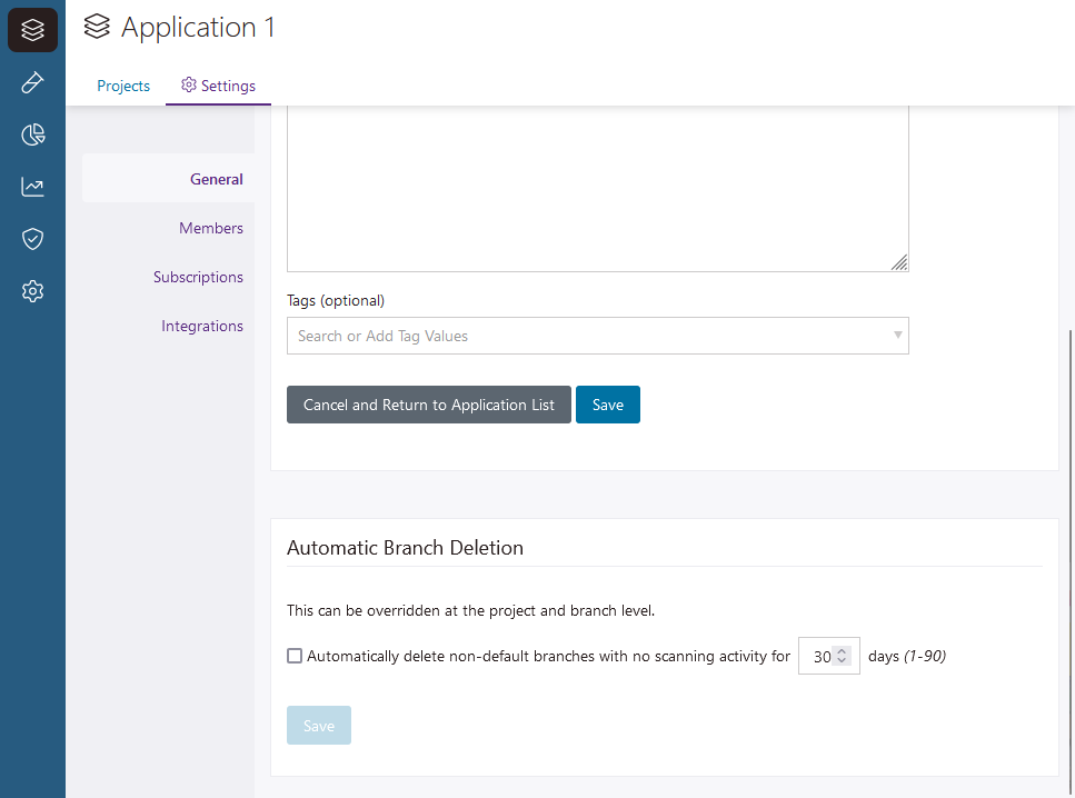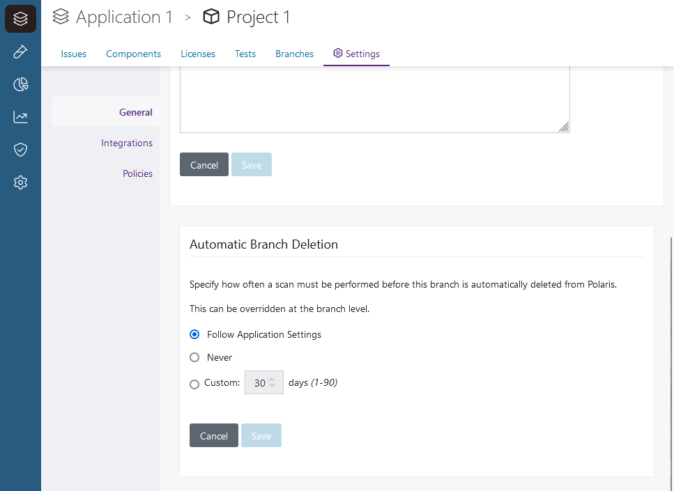 Note: A branch's automatic deletion setting overrides project and application settings; a project's automatic deletion setting overrides application settings. This way, even if an application is configured so non-default branches that aren't tested for a day are deleted, you can still preserve specific branches (or branches in specific projects) indefinitely, or for a longer duration.