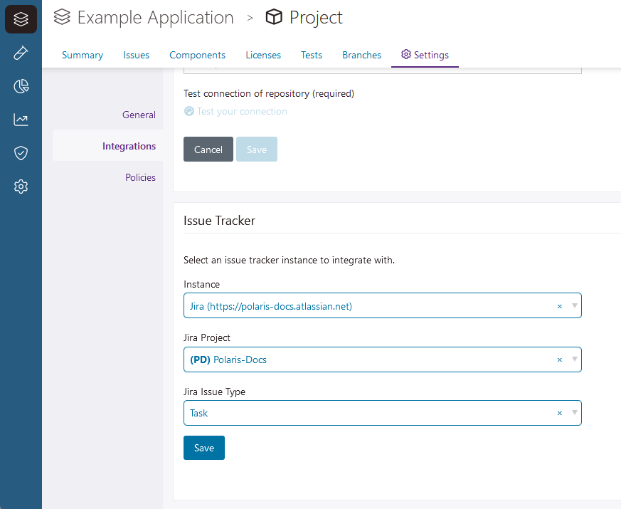 This page describes the issue tracking integration for Jira, and what you need to do to connect Polaris to Jira. Once configured, the issue tracking integration allows Polaris to create tickets in Jira for issues captured in Polaris.