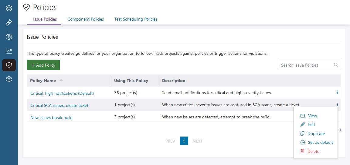 The following is a summary of the Polaris UI Policies page which allows you to create issue and test scheduling policies for projects.