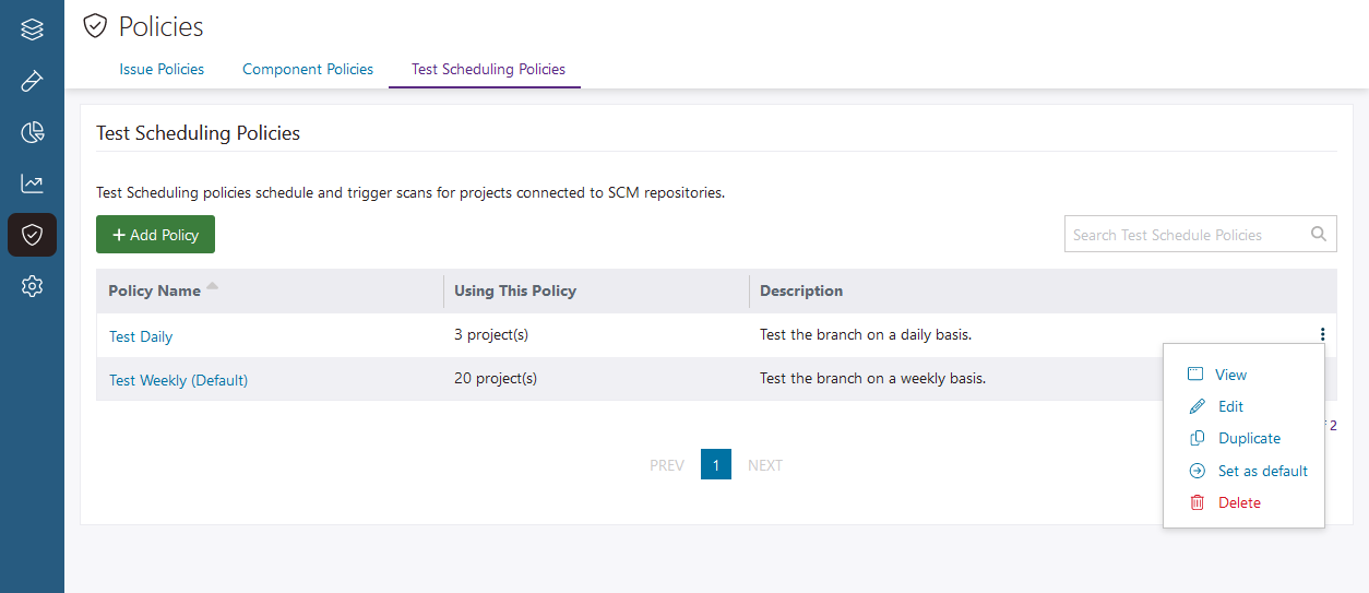 Test Scheduling Policies tab Create and manage test scheduling policies that instruct Polaris to scan branches connected to repositories automatically, on a daily or weekly basis. Note: For more information, see Test scheduling policies.
