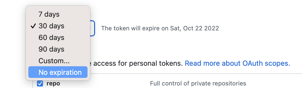 - Set the token's expiration date. To avoid issues, we recommend No expiration.