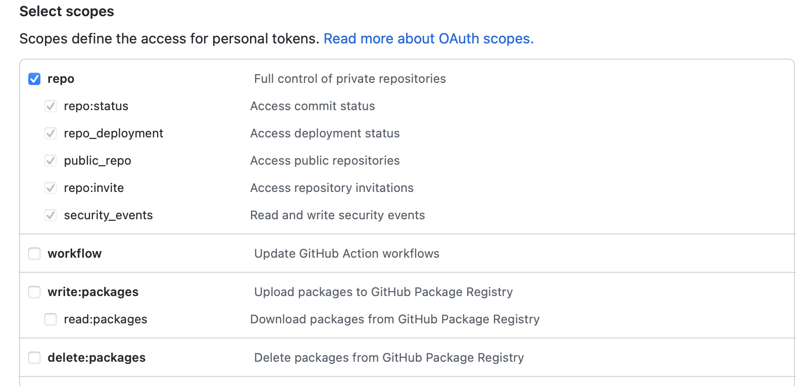 - Under Select scopes, access to repo is required.