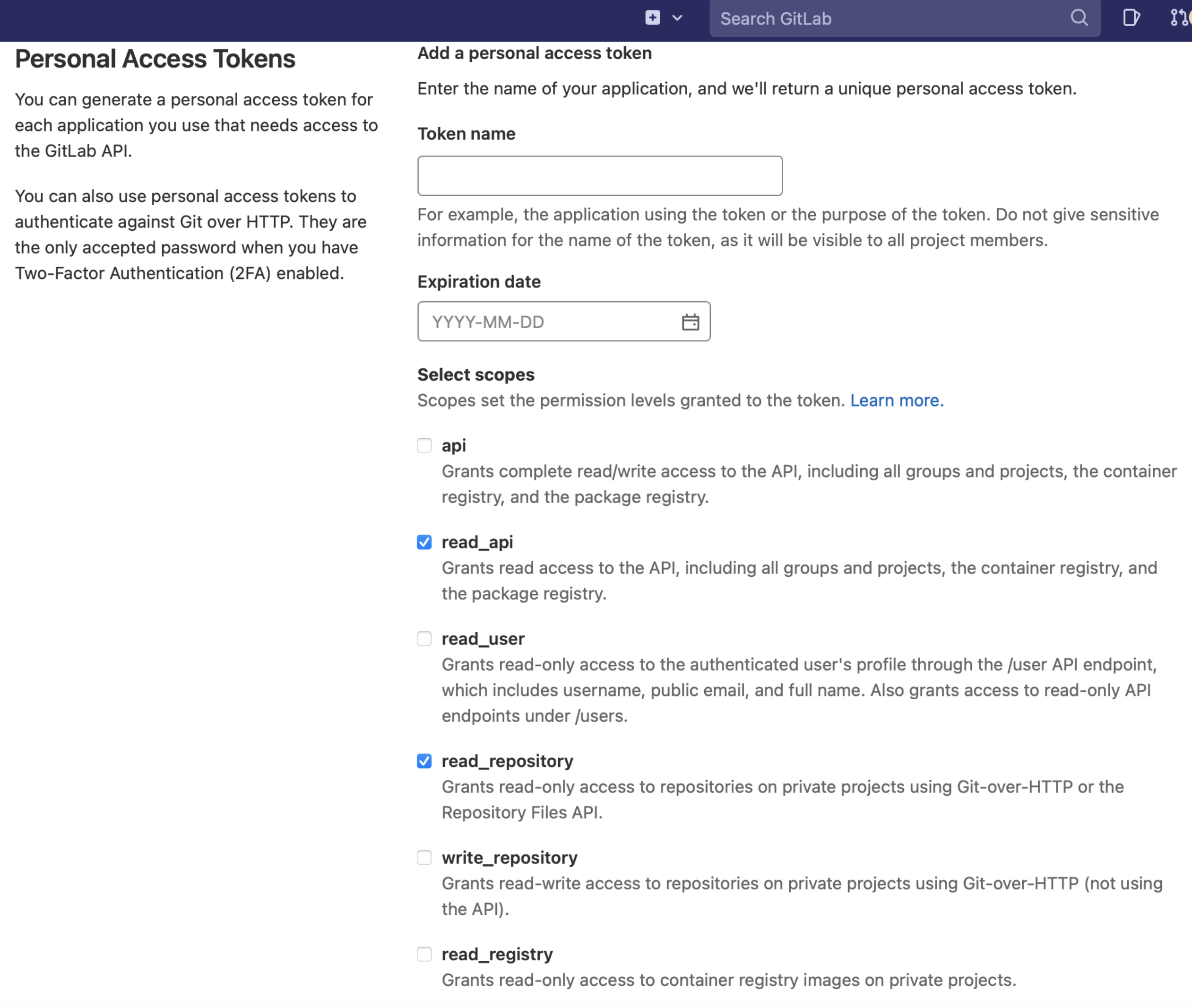 Note: For more information on creating access tokens, see the documentation for GitLab (link). - Set the token's expiration date. To avoid issues, we recommend